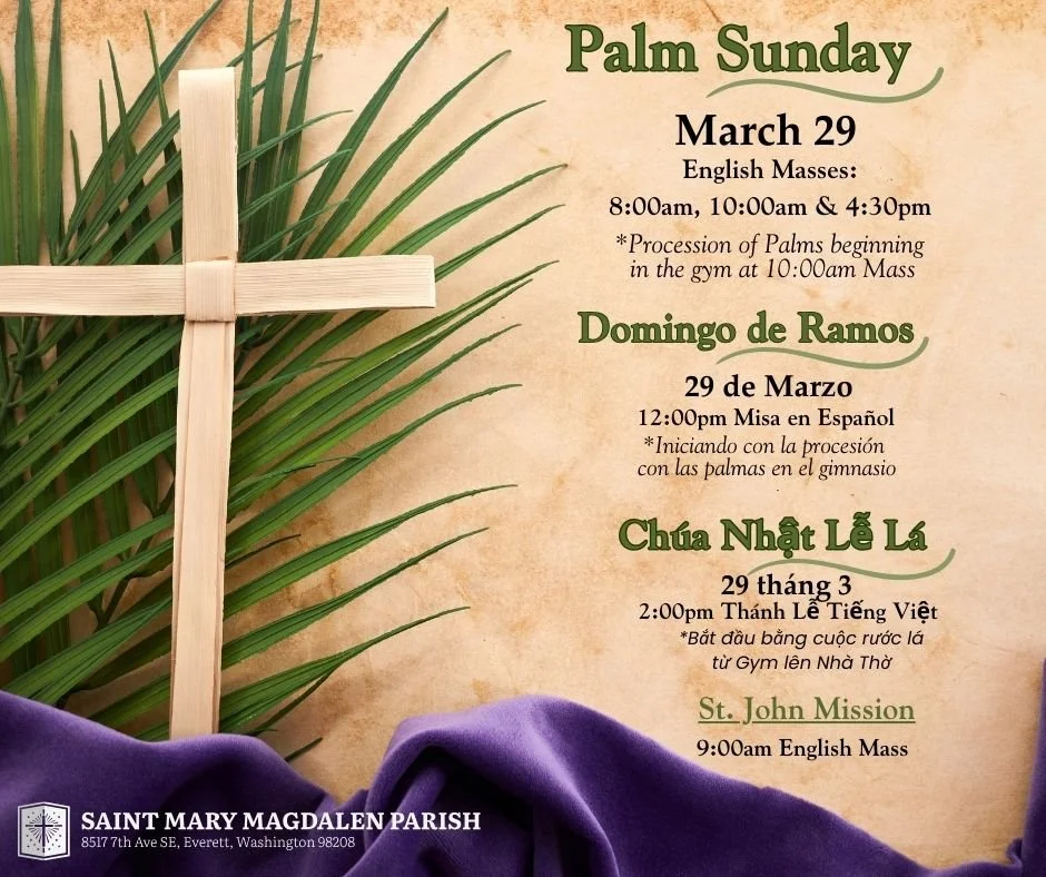 Palm Sunday Saturday, March 28, 2026 5:00 PM Sunday, March 29, 2026 4:30 PM Saint Mary Magdalen Parish & Saint John Mission 8517 7th Avenue Southeast Everett, WA, 98208 United States (map) Google Calendar ICS